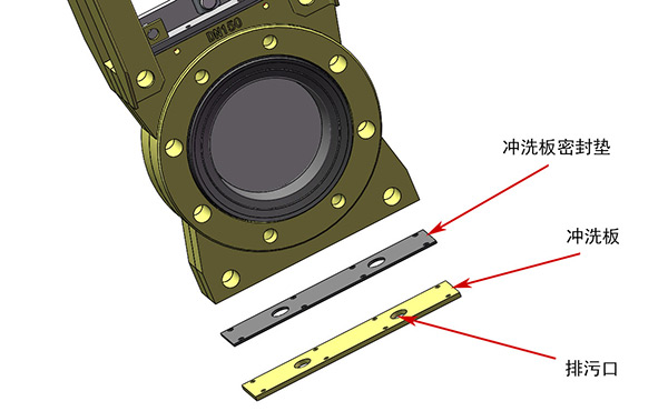 阀门底部有一个内置清洁区,清洁区安装有一个可拆卸的冲洗板进行封闭。排污口可以排出内部堆积的浆料,保证闸板完全关闭。